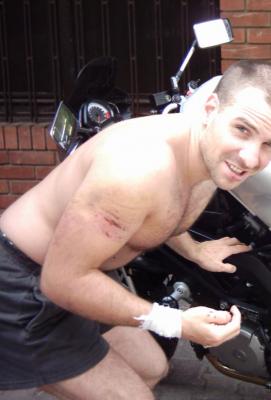A Motor belefúródott az autó oldalába, én meg azt mondják, hogy meg is fejeltem a B oszlopot. Aztán a földre zuhantam. Elég sokára ért ki a mentő, amivel az újpesti Árpád kórház intenzív osztályára szállítottak, onnan 3 nap megfigyelés után kiengedtek. Zúzódásaim lettek és a képeken látható csúszási bőrsérülések. Amit a képeken láttok, az már a gyógyult állapot.