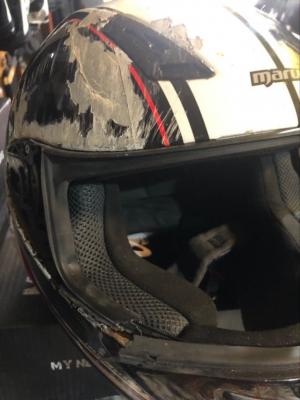 Elmesélte ahogyan a képeken látható durva balesetet elszenvedte. Egy teherautós fordult elé és már nem volt lehetősége elkerülni az ütközést. Körülbelül 70km/ órával csapódott a teherautó oldalának, ennek a nyomait viseli a sisak bal oldala, majd kb.húsz métert repülve, az aszfaltra érkezett. A sisak tökéletesen teljesített, semmi sérülés nem történt a fején, pedig a jobb oldala is megszenvedte a sisaknak az aszfalthoz csapódást és a csúszást!