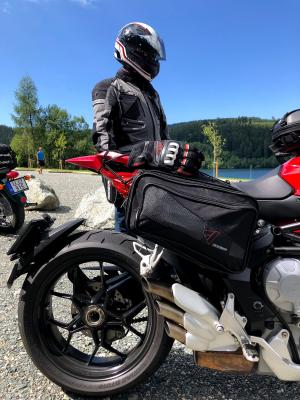 "A Modeka Regular nyeregtáska már a legelső alpesi utunk során is velünk volt, így ez a termékünk az elmúlt 5 év használat során bizonyította tartósságát. Ott volt a Horvátország-Szlovénia kiránduláson is, és most is ő nyelte el a magammal vitt holmik 95%-át. Nagyon egyszerű a rögzítése és magától értetődő minden ezen a termékünkön. Megfelelő rögzítéssel még tartókonzol nélkül sem mozdul el és nem lifeg. Ez nem lenne nagy szám egy túraendúrón, de azért egy izmos gyorsításokra és tempós kanyarokra termett MV Agusta esetében konzol nélkül , ez egy igazán meggyőző tulajdonság. Nagyon szeretem, mert minden eddigi motoromra egy pillanat alatt lehetett feltenni és az uticélhoz megérkezve levenni a motorról. A tárolókapacitás több napos túra esetében is elegendőnek bizonyult. Bátran ajánlom ezt a termékünket. Kinyitva a bővítési lehetőséget kínáló cipzáras részt, azt gondolom mindenki elegendő tárolókapacitást fog találni benne még több napos túrára is. "